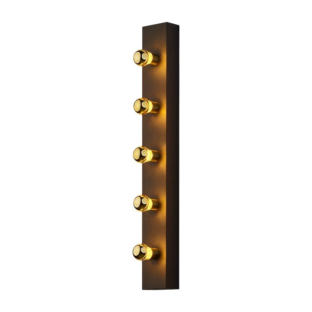 Ma miejsce na pięć źródeł światła. Kinkiet w czarnym kolorze zdobią srebrne lub złote żarówki – do wyboru.