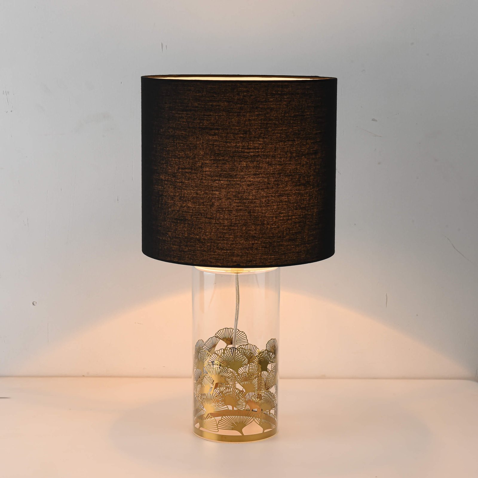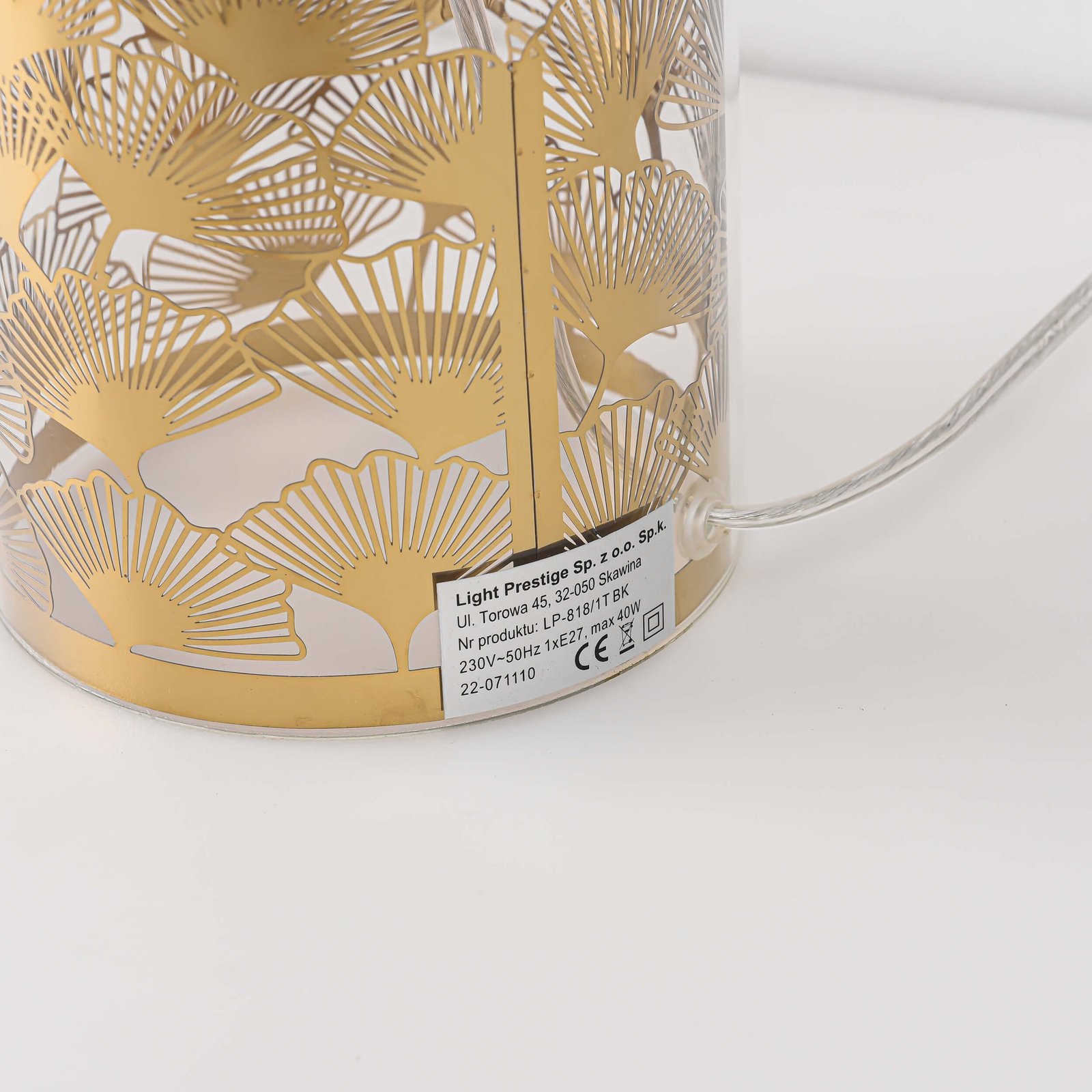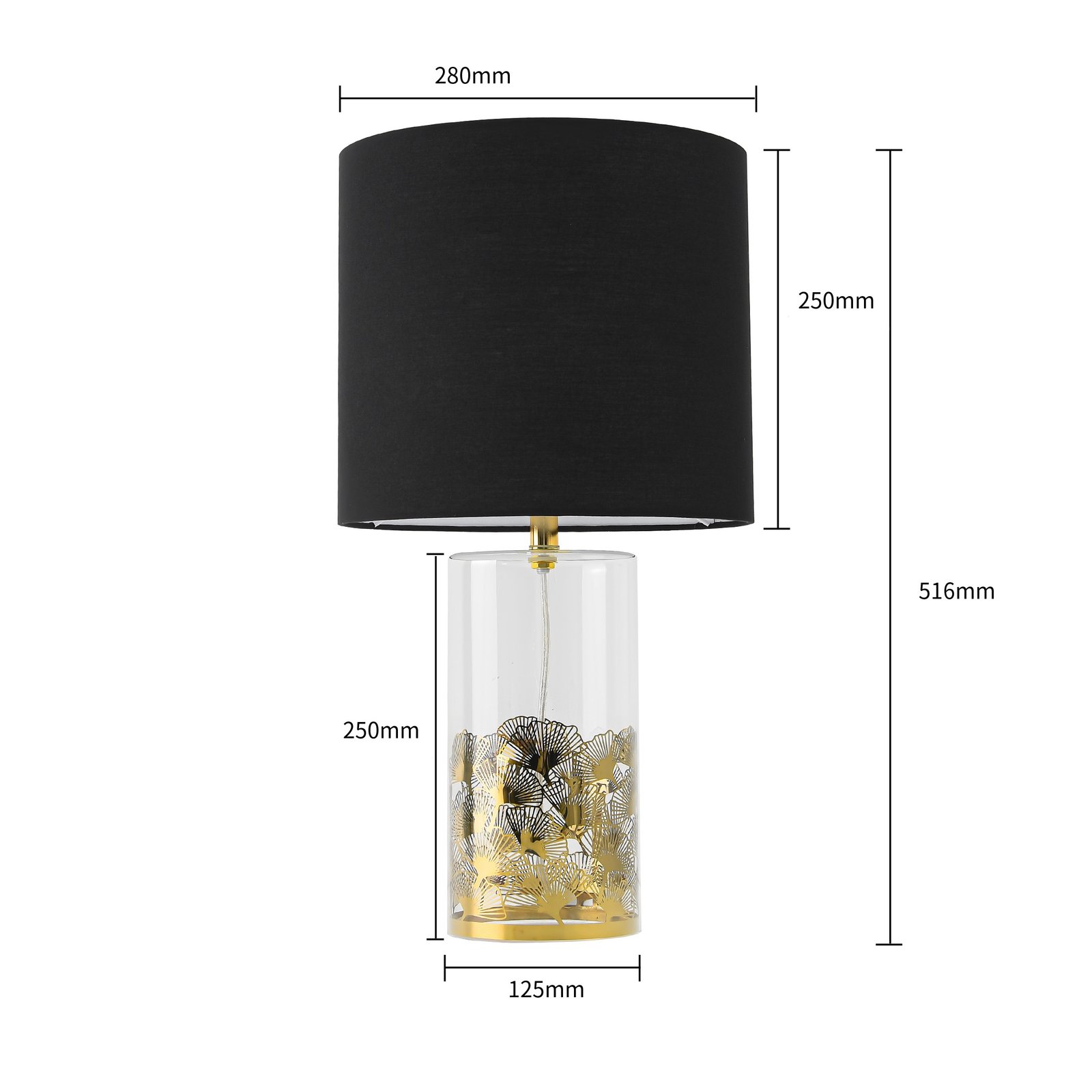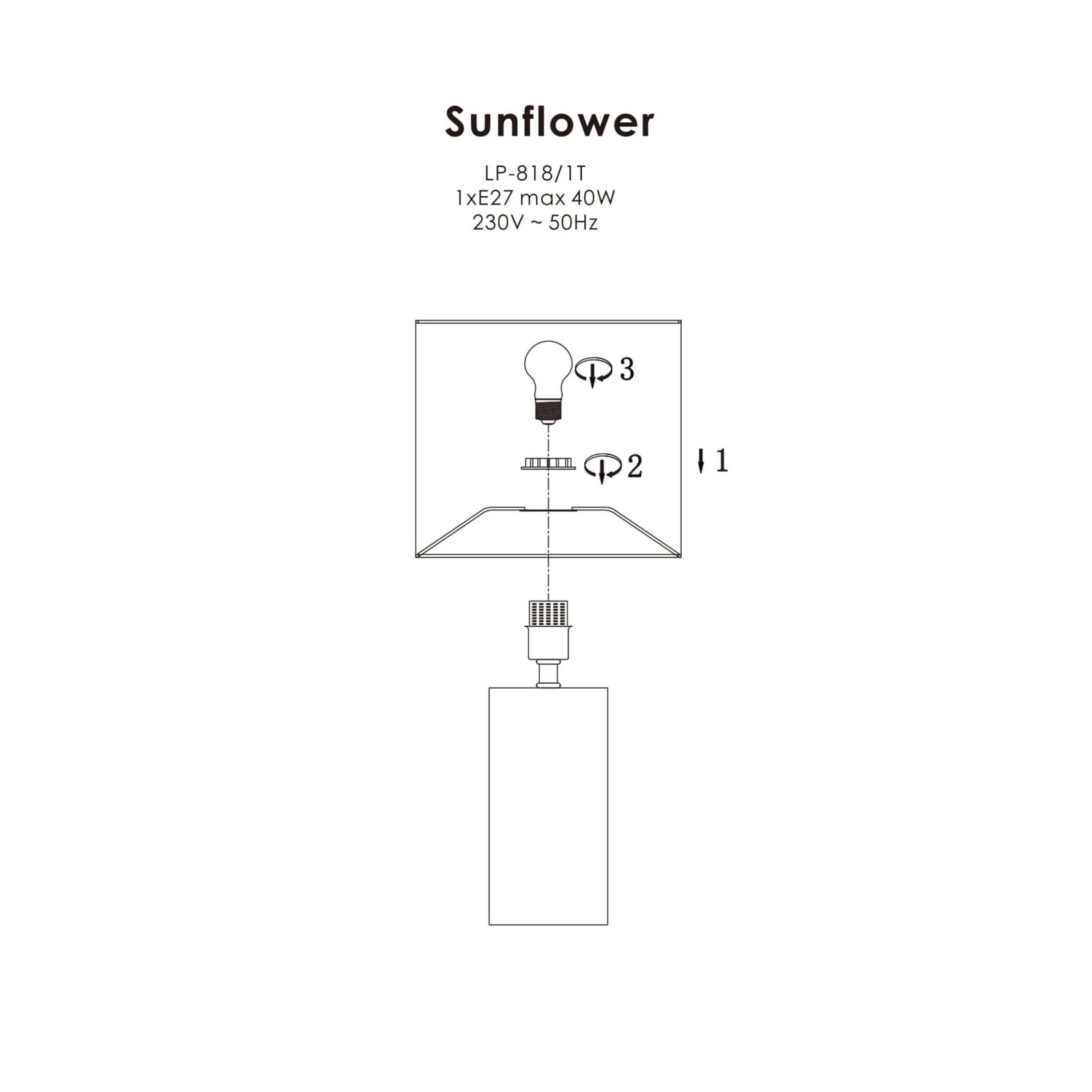 Rodzaj lampy: Lampa stołowa, lampa biurkowa z kolekcji Sunflower. Wymiary: Lampa posiada ponad 51 cm wysokości, średnica klosza wynosi 28 cm, natomiast średnica podstawy wynosi 12,5 cm. Materiał i kolorystyka: Podstawa lampy jest wykonana z transparentnego szkła z ozdobnymi wzorami w złotym kolorze. Klosz lampy jest wykonany z czarnej tkaniny. Źródło światła: Lampa posiada wejście na żarówkę o gwincie E27.