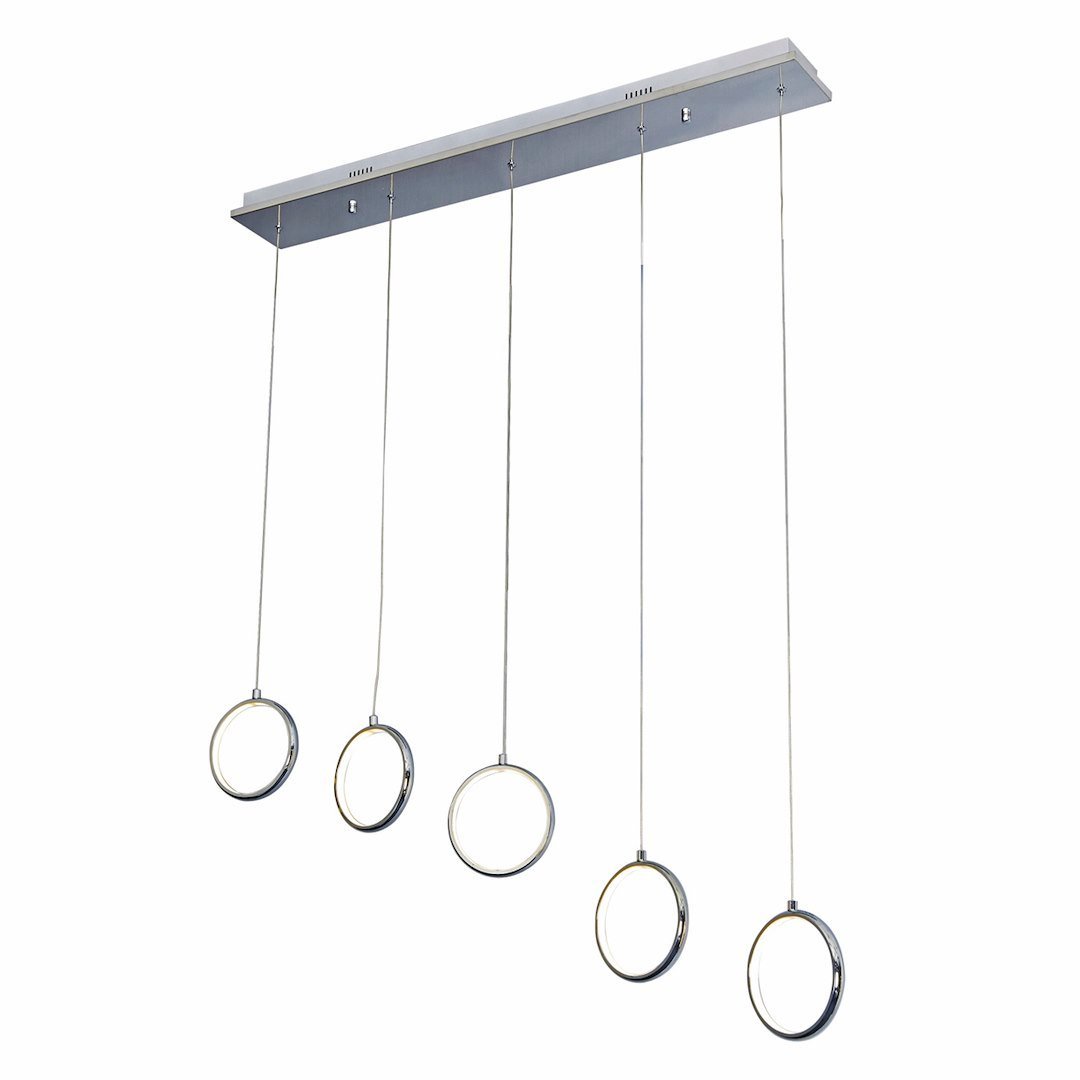 „Pięć wiszących chromowanych opraw to znak rozpoznawczy lampy firmy MiLAGRO z kolekcji Anello. W każdej z lamp zainstalowano na stałe moduł LED, których łączna moc wynosi 35 W, co odpowiada 175 W tradycyjnej żarówki. Wymiary lampy to: 85 cm długości i 10 szerokości, średnica każdej oprawy ma 12 cm. Ogromna zaletą Anello 272 jest możliwość dowolnej regulacji wysokości każdej oprawy z osobna na przewodzie do 90 cm. Strumień świetlny ma 1470 lm oraz przyjemną dla oka, neutralną barwę 4000 K.