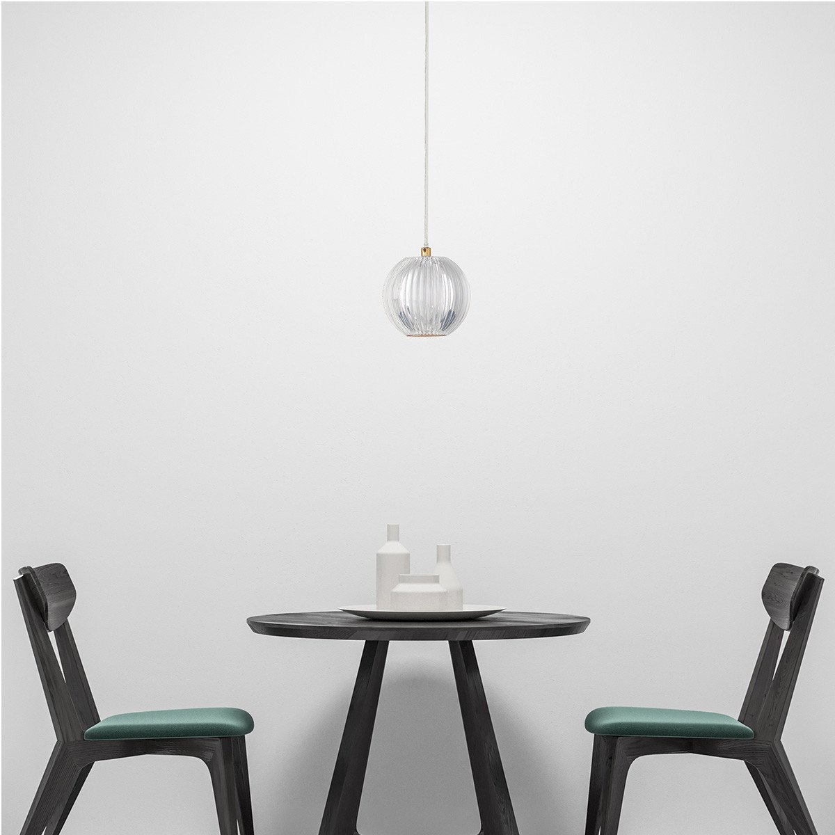 Konstrukcja lampy wiszącej Brillant wykonana została z metalu w złotym odcieniu, uzupełniona akrylowymi kloszami o transparentnym wykończeniu z prostym wzorem kreseczek rozmieszczonych dookoła, co nadaje jej niepowtarzalny urok oraz elegancję. Transparentny kabel doskonale komponuje się z resztą elementów lampy, tworząc spójną całość.