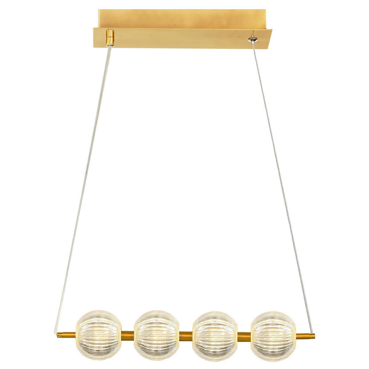Konstrukcja lampy wiszącej Brillant została wykonana z metalu w złotym odcieniu, uzupełniona akrylowymi kloszami z prostym żłobieniem w formie kreseczek, co nadaje jej niepowtarzalny urok oraz elegancję. Transparentny kabel doskonale komponuje się z resztą elementów lampy, tworząc spójną całość.