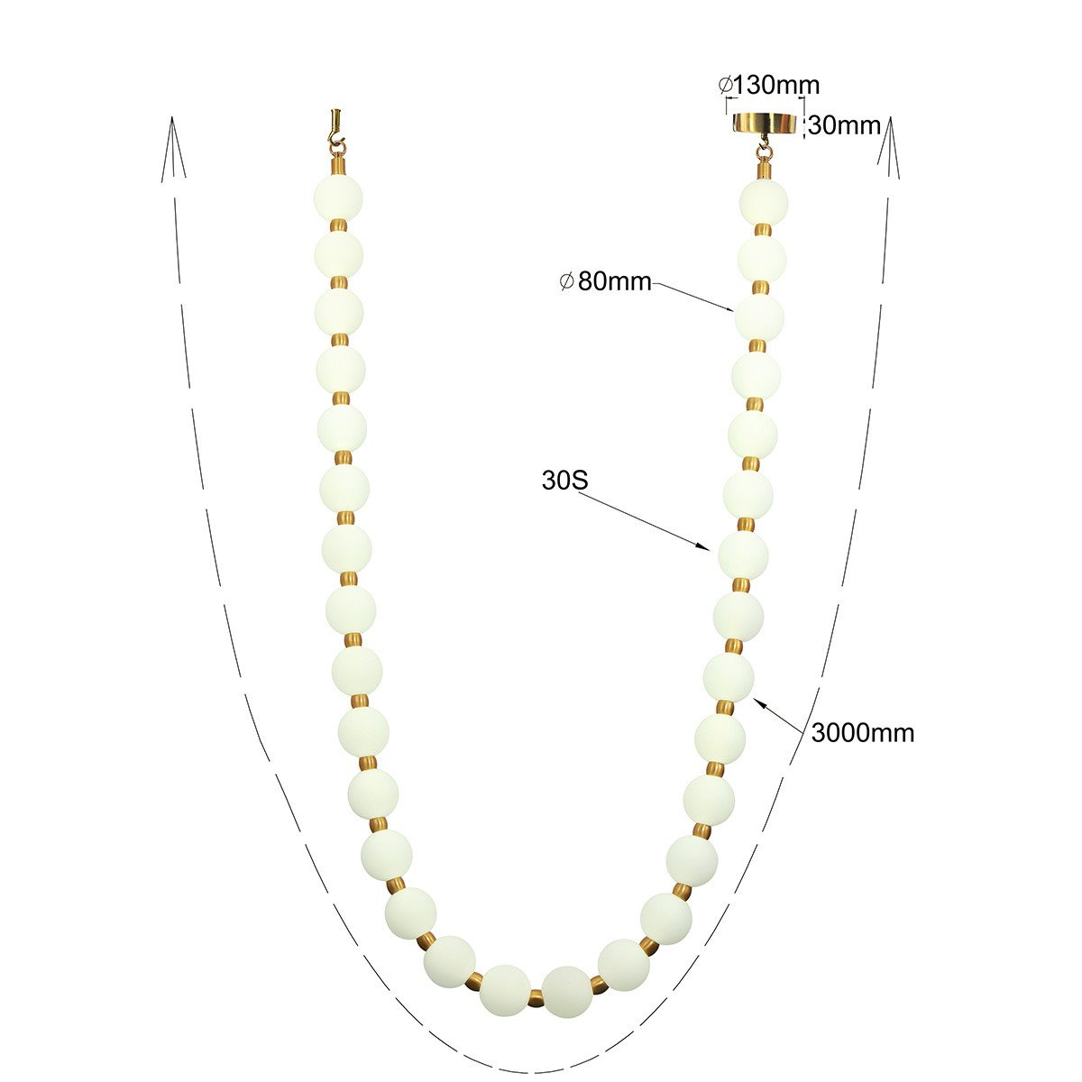 Lampa Dorado Rope z kolekcji Dorado wyróżnia się niekonwencjonalnym kształtem liny, którą tworzą połączone ze sobą okrągłe klosze wykonane z białego akrylu. Klosze te delikatnie rozpraszają światło, zapewniając przyjemne i równomierne oświetlenie pomieszczenia. Złote metalowe łączenia między kloszami oraz eleganckie podsufitki dodają całości szyku i nowoczesnego charakteru. Lampa ma długość 3 metrów i jest montowana na dwóch podsufitkach. Dorado Rope wyposażona jest w zaawansowane oświetlenie LED CCT, które pozwala na ustawienie preferowanej barwy światła – od ciepłej, przez neutralną, aż po zimną – jeszcze przed montażem, co pozwala na idealne dopasowanie do różnych wnętrz i ich funkcji. Dzięki swojemu unikalnemu designowi i nowoczesnym funkcjom, lampa Dorado Rope doskonale sprawdzi się zarówno w przestrzeniach mieszkalnych, jak i komercyjnych, wnosząc do nich element elegancji i funkcjonalności.