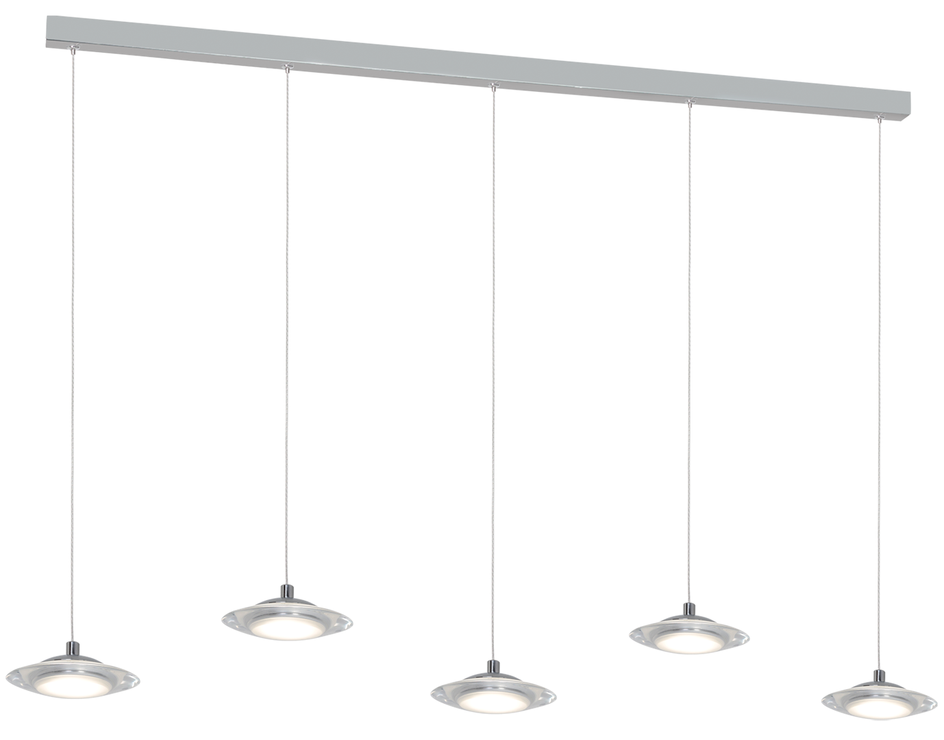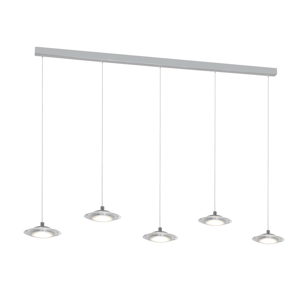 „Nowoczesna wisząca lampa LED jest połączeniem współczesnego wzornictwa, starannego wykonania oraz najlepszych materiałów. Posiada 5 punktów światła, które można dowolnie regulować od 40 do 100 cm wysokości. Łączna moc modułów LED to 25 W, które odpowiadają 126 W tradycyjnej żarówki. Do tego jasny strumień świetlny – 1750 lm o neutralnej białej barwie 4000 K. Szerokość elementu świetlnego to 80 cm, z kolei średnica każdego klosza wynosi zaledwie 12 cm. Lampę wykończono w eleganckim i stylowym chromie.