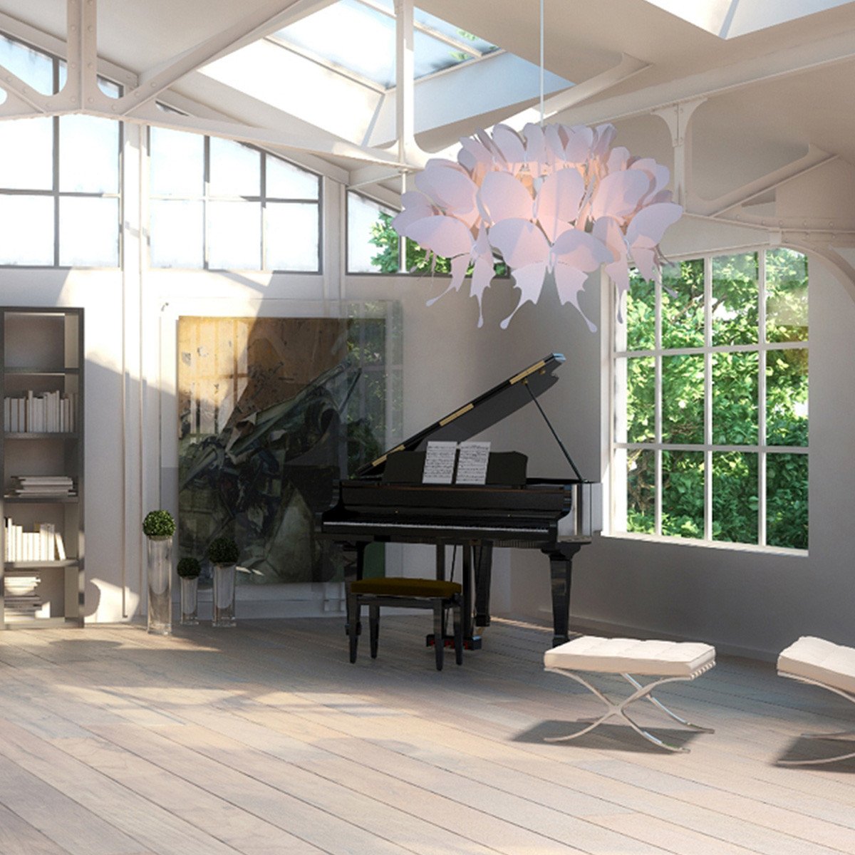Lampa wisząca Farfalla w pastelowym, różowym kolorze przeniesie cię w magiczny świat wakacyjnych łąk pełnych motyli. Ten nowoczesny i inspirujący model o dużym kloszu z akrylowymi motylami z pewnością wzbogaci każde wnętrze.