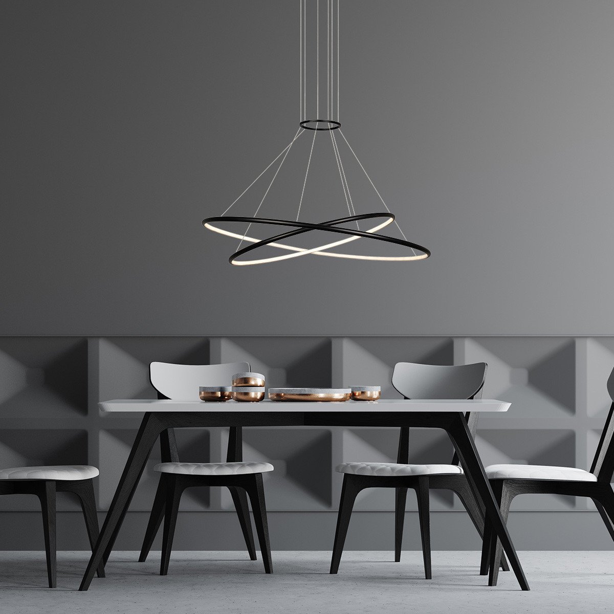Lampa wisząca Halifax została wykonana z metalu. Zbudowana jest z dwóch okręgów z wbudowanym światłem LED CCT (Correlated Color Temperature) o zmiennej barwie światła. Do wyboru posiadamy neutralną, ciepłą i zimną barwę światła, którą ustawiamy przed montażem w podsufitce lampy. Lampa posiada imponującą długość, co sprawia, że jest świetną propozycją do takich pomieszczeń jak salon, jadalnia, czy kuchnia.