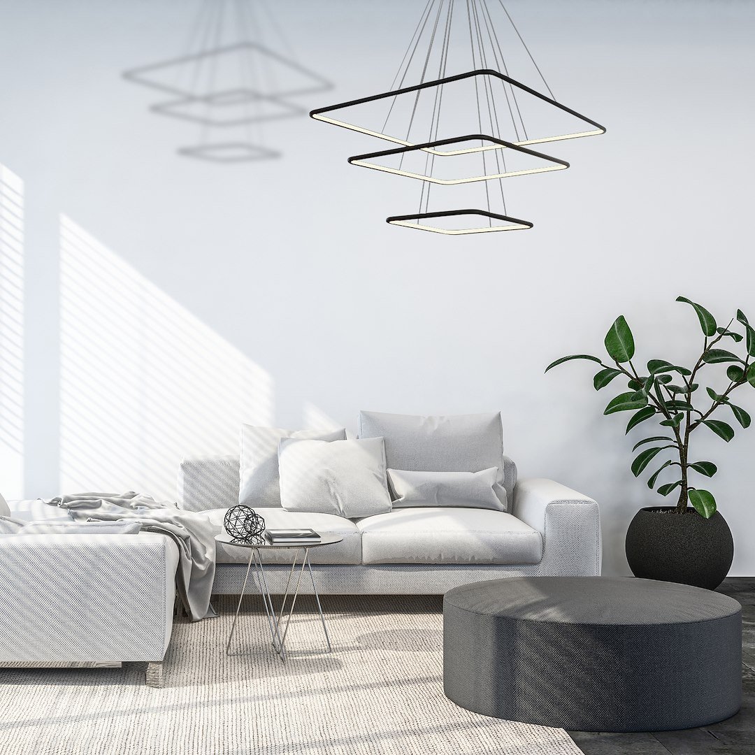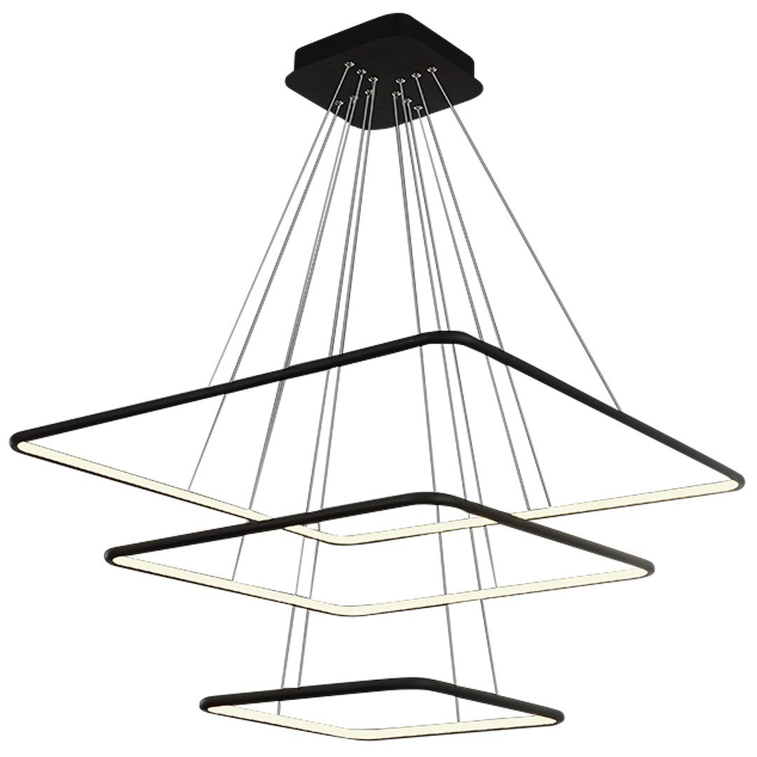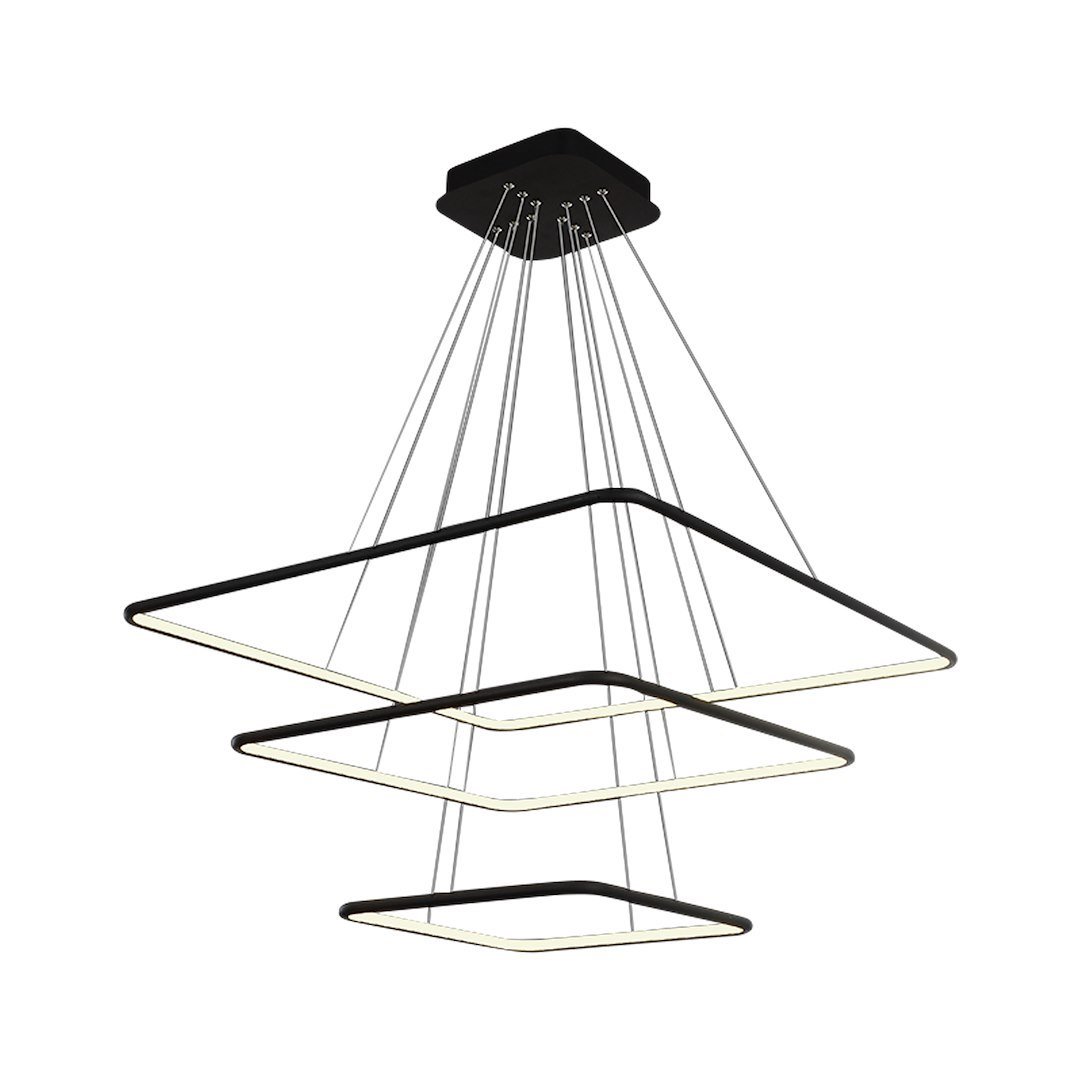 NIX BLACK 519 to lampa sufitowa umieszczona na regulowanych zawiesiach, które z drugiej strony zostały wmontowane w kwadratową podsufitkę. Model ten składa się z trzech opraw, w kształcie kwadratów ułożonych w poziomie. W oprawach o zróżnicowanej wielkości umieszczono trzy punkty świetlne w formie modułu LED. Szerokość lampy w najszerszym miejscu sięga 80 cm, a szerokość najmniejszej obudowy wynosi 40 cm. Energooszczędny LED ma moc 117 W, co odpowiada mocy 585 W w przypadku tradycyjnej żarówki. Wymienne moduły LED świecą ciepłą, białą barwą o temperaturze 3000 K. Strumień świetlny tego urządzenia to 8190 lm.