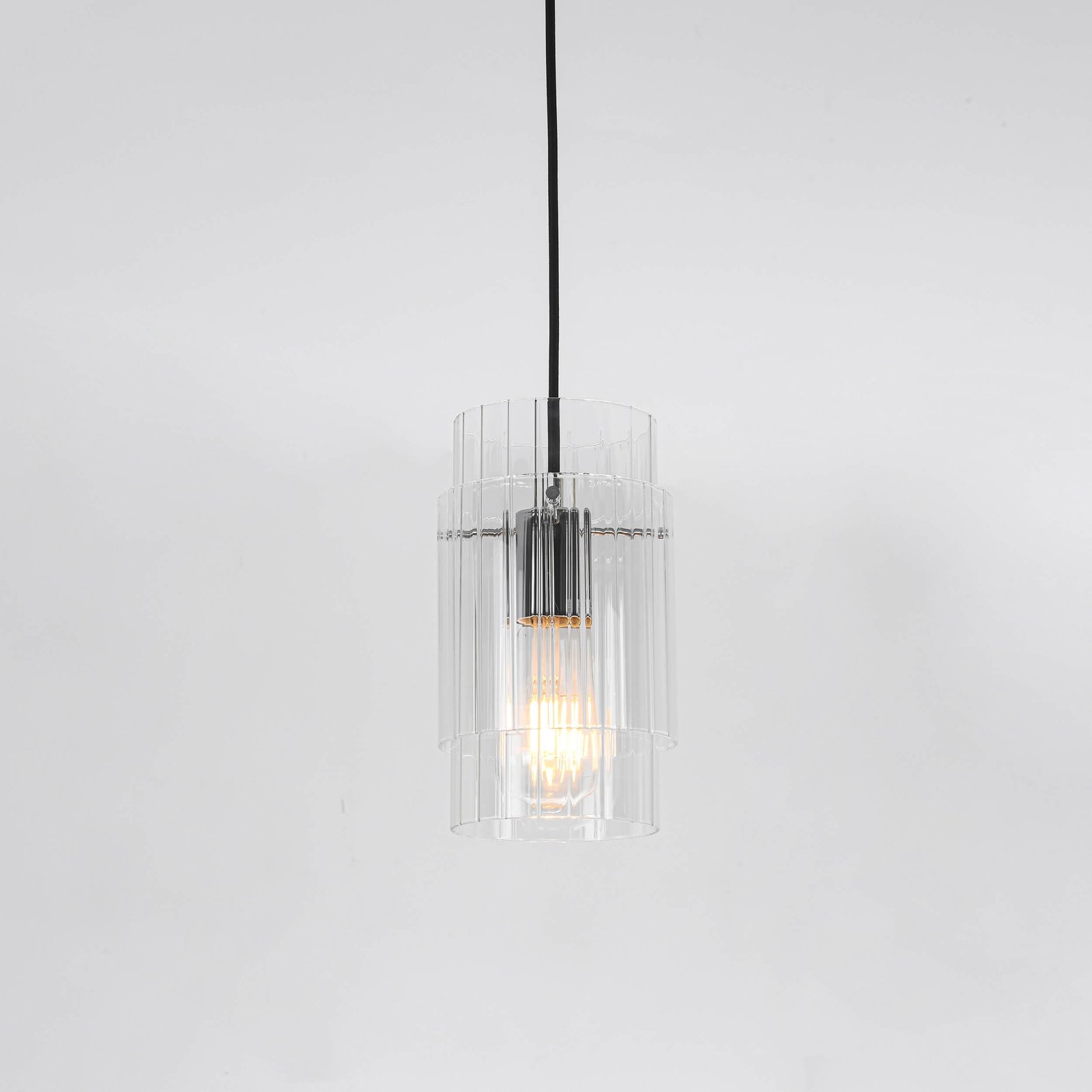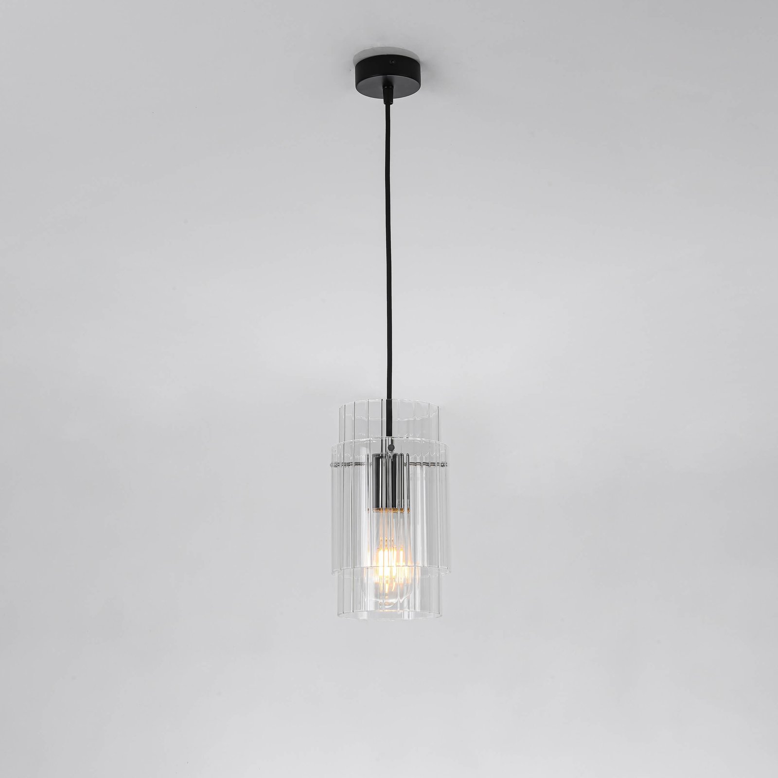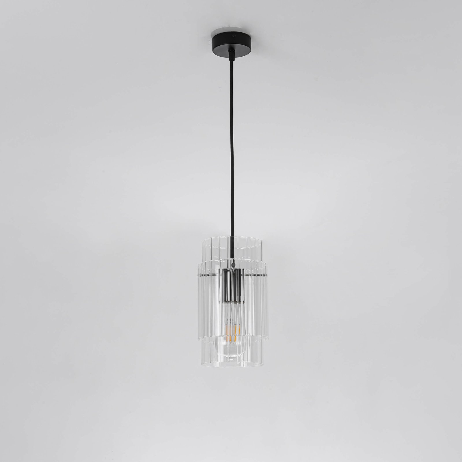 Materiał i kolorystyka: Transparentny szklany klosz, czarna metalowa podsufitka, srebrny element wewnątrz klosza.