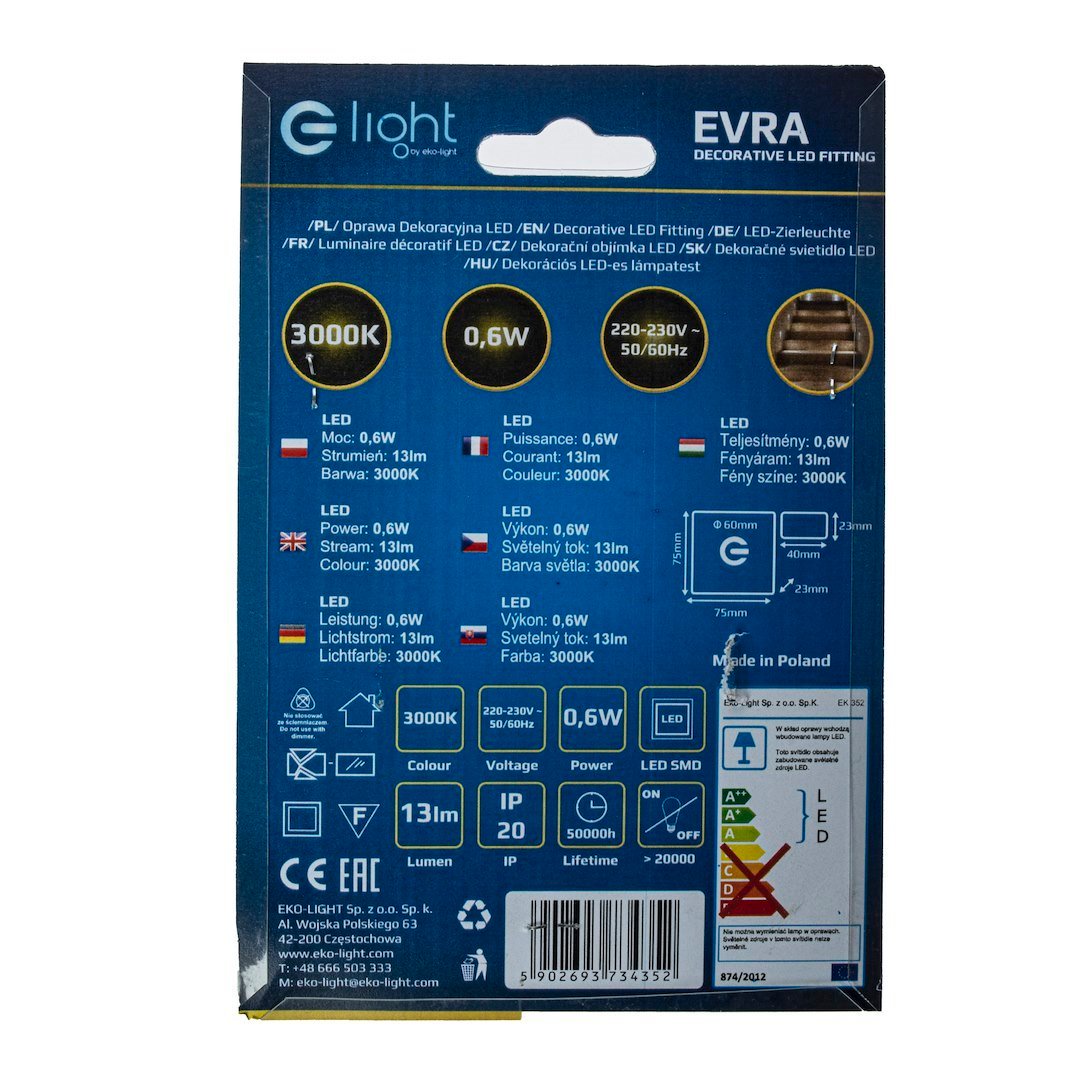 Oprawy Schodowe Eko-Light to wysokiej jakości oprawa LED o charakterze dekoracyjno-użytkowym. Znajduje zastosowanie przy oświetlaniu korytarzy, ciągów schodowych, dekoracyjnym podświetlaniu mebli oraz tworzeniu aranżacji świetlnych w architekturze wnętrz. Oprawa montowana do puszki instalacyjnej O60 bezposrednio na 230V.