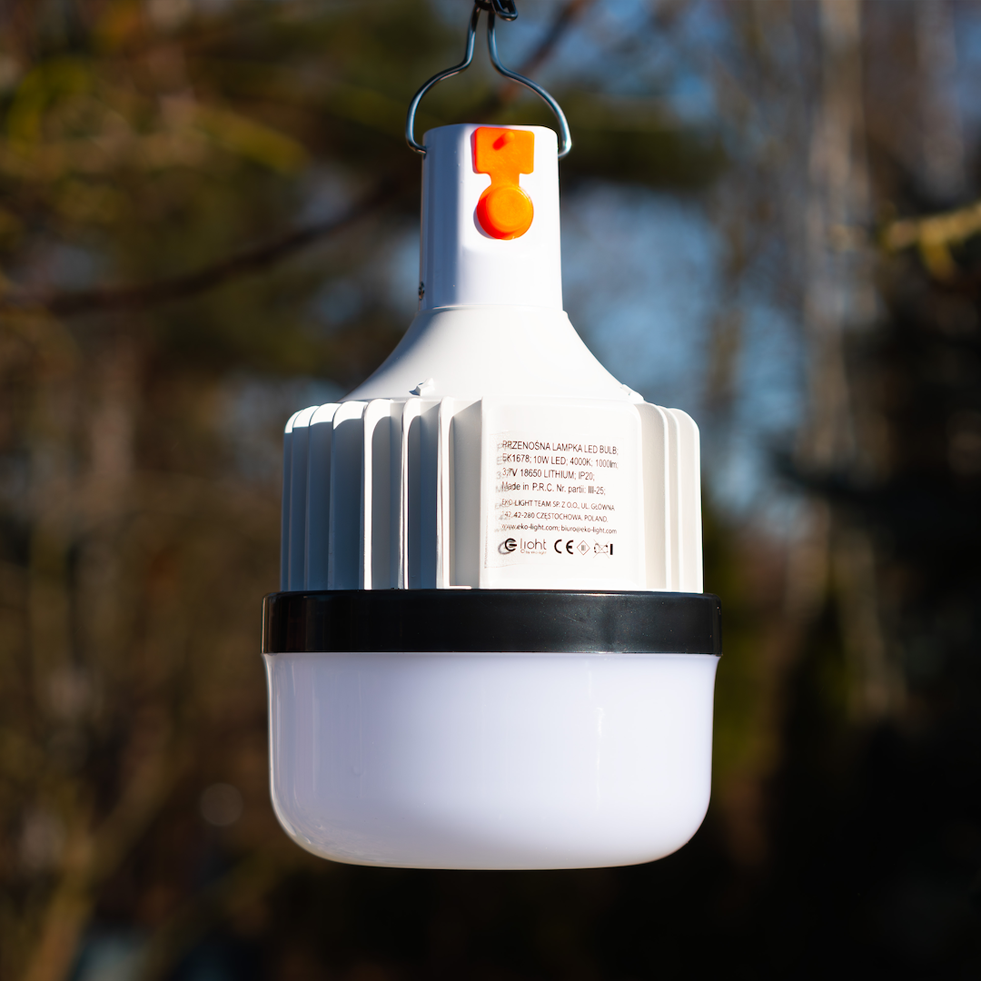 Przenośna lampka LED Bulb to wygodne i funkcjonalne źródło światła o neutralnej barwie 4000K, zapewniające jasność 1000 lm. Dzięki akumulatorowi 18650 3,7V i ładowaniu USB (DC5V) sprawdzi się w różnych warunkach – od biwakowania po codzienne użytkowanie w domu. Kąt świecenia 180° umożliwia skuteczne rozproszenie światła. Możliwość zawieszenia lub ustawienia daje pełną swobodę użytkowania.