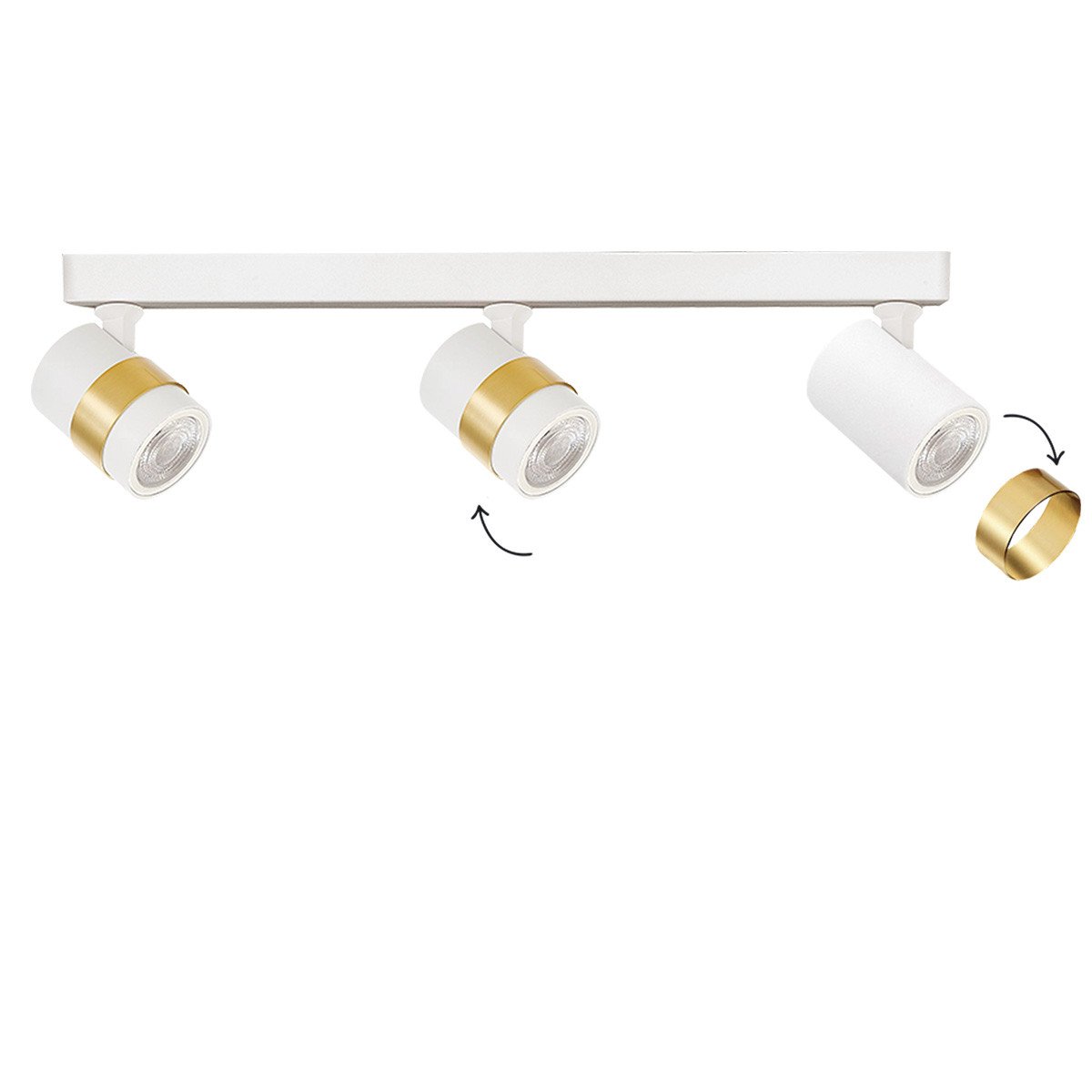 Spot Anillo 3 to harmonijne połączenie minimalistycznego stylu z subtelnym akcentem luksusu. Jej nowoczesny design charakteryzuje się solidną, białą, metalową konstrukcją, nadającą jej elegancki wygląd i trwałość. Dekoracyjne złote pierścienie otaczające reflektory dodają elegancji, nadając lampie wyjątkowego charakteru dekoracyjnego, który wzbogaci każde wnętrze.