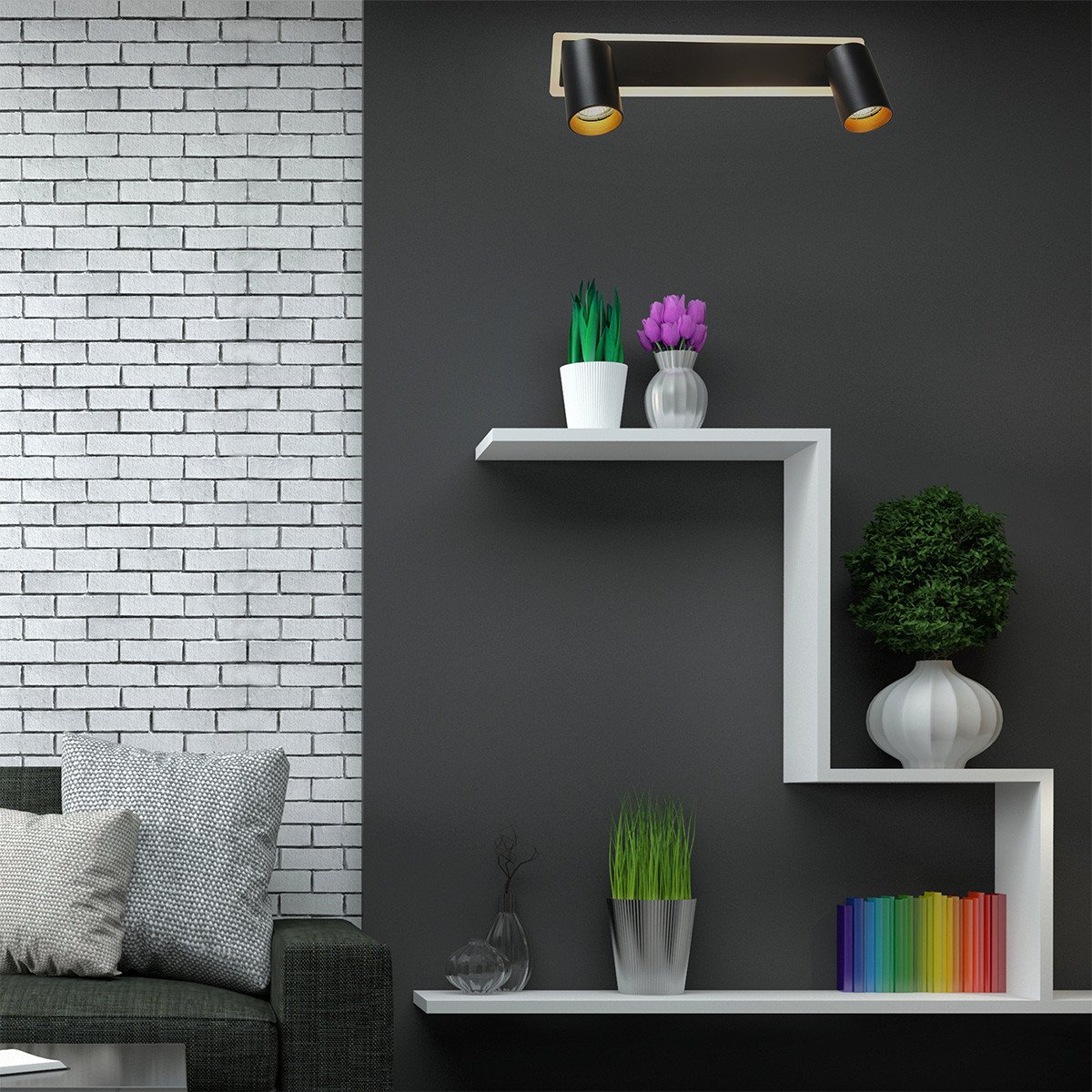 Spot Parma 2 jest wykonany z metalu w czarnym kolorze. Posiada dwa ruchome reflektorki z możliwością wymiany obręczy. Do wyboru mamy czarne lub złote obręcze (obie wersje znajdują się w zestawie). Dodatkowo reflektory posiadaja regulację kąta nachylenia co sprawia, że można ustawić kierunek padania światła dokładnie w wymaganym kierunku, np. na biurko. Reflektorki posiadają miejsce na żarówki o gwincie GU10 oraz wbudowane światło LED o zmiennej barwie światła CCT, co oznacza że można ustawić dowolną barwę światła od ciepłej poprzez neutralną, aż po zimną. Barwę światła ustawia się przed montażem w podsufitce lampy.