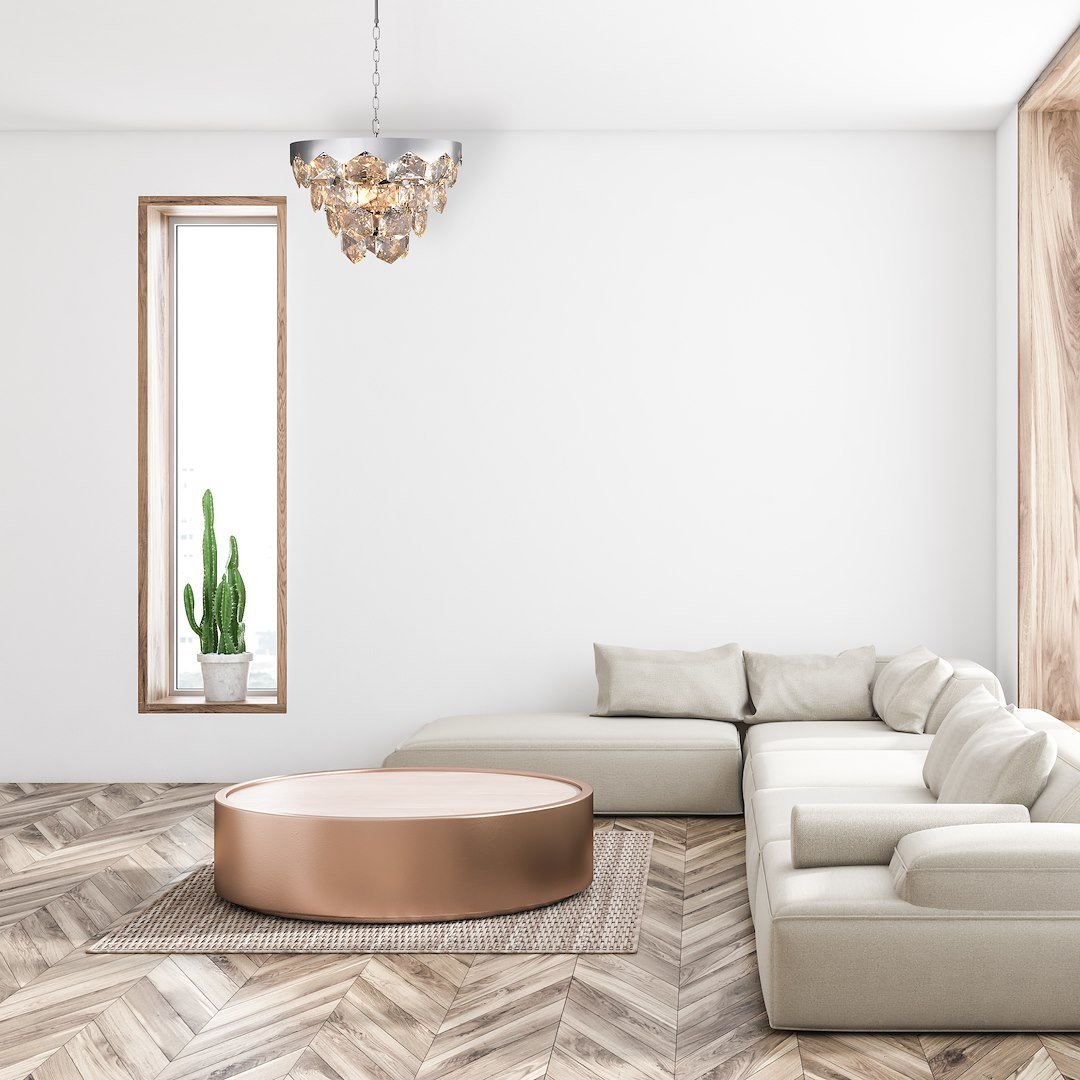 Żyrandol wyróżnia się swoim designem, który idealnie sprawdzi się w przestrzeniach typu glamour. Lampa została wykonana z wysokiej jakości materiałów: metal i kryształ, co nadaje jej bardzo eleganckiego charakteru. Model dostępny jest w chromie i złocie. Światło odbijające się od mieniących się kryształów sprawi, że żyrandol będzie dobrze się prezentował zarówno w salonie jak i w sypialni. Może również stanowić element ozdobny w lokalach użytkowych.